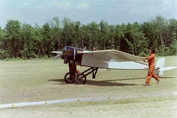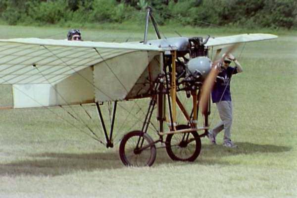Die älteren Flugzeugmuster, wie dieser Bleriot-Eindecker, benötigen bei starkem Wind eine helfende Hand! Der Anzani Sternmotor tuckert langsam vor sich hin.... |